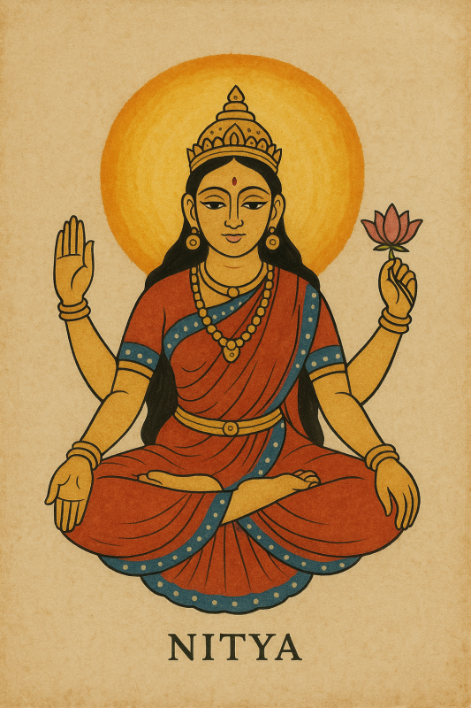 Termenul nitya nseamnă “eternitate” sau “permanență” și desemnează Suprema Conștiință Divină sau Absolutul. Simbolismul tantric tradițional asociază aceste nitya-uri cu mișcarea ciclică al Lunii, a Soarelui, precum și al altor planete. De fapt, știința secretă a nitya-urilor mai este denumită și kala-vidya (știința secretă a cuantelor esențiale ale energiei supreme).