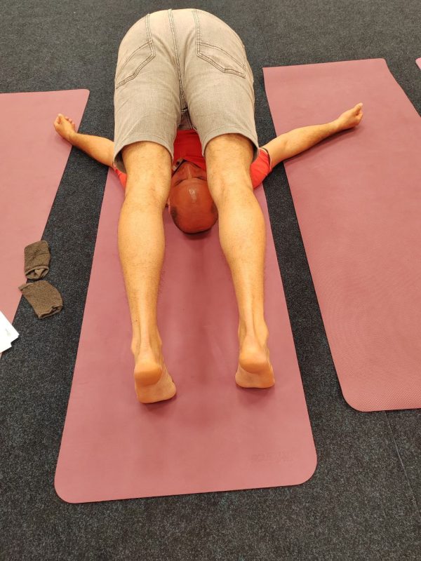 Ne putem ajuta de mâini pentru a ne susţine spatele, pâna când ajungem în poziţia dorită, după care vom aşeza mâinile pe sol pe lângă corp, cu palmele situate cu faţa în jos.